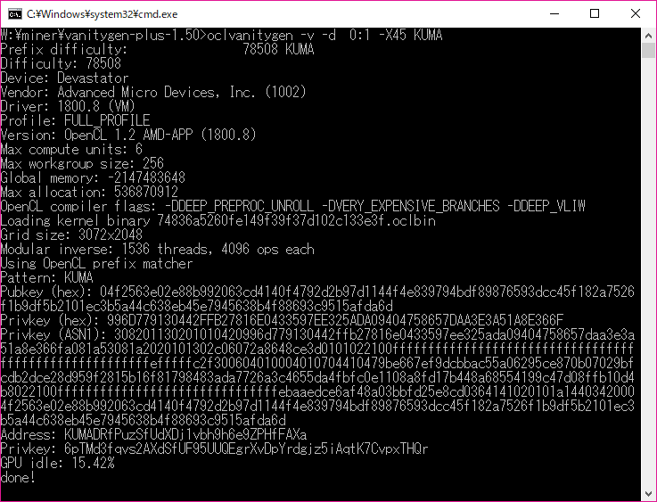 oclvanitygen -v -d 0:1 -X45 Kで始まる文字列